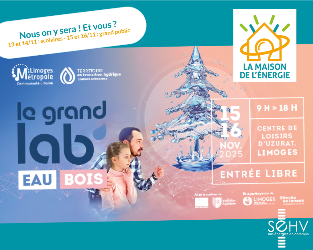 Du 13 au 16 novembre, la Maison de l’Énergie du SEHV participera au Grand Lab’EAU-BOIS au Centre de loisirs d’Uzurat à Limoges.